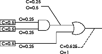 Using controllability values and assuming an observability of 1 for the primary outputs, observability of each of the circuit lines can be calculated. Observability values calculated for circuit lines of Figure 3 are shown in this figure.