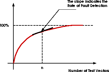 The above expression for fault coverage estimate represents an exponential function, shown in Figure 10. This indicates that fault detection becomes harder when fewer faults remain to be detected. The slope of this curve represents the rate of faults being detected. The expression shown below represents this rate (RFD = Rate of Fault Detection).
