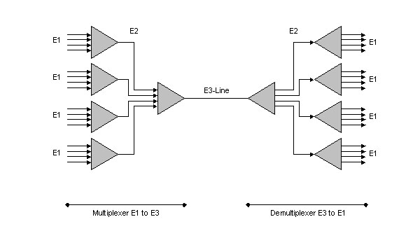 For transmitting many E1 channels over one line, the ITU describes in the standard G.742 a method for multiplexing four E1 channels to one E2 channel and in the standard G.751 a method for multiplexing four E2 channels to one E3 channel. The used technique is Time Division Multiplexing (TDM).