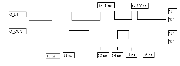 The signal value Q_IN is assigned to the signal Q_OUT with 1 ns delay. Although it is an inertial delay with switching time equal to 1 ns, the reject time is specified to 500 ps (.5 ns) and only impulses shorter than 500 ps will not be transmitted (Fig. 3).