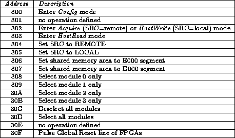 I/O port writes convey information to the control GALs via the lower four bits of the address, not the data bits. Hence, any value can be output, only the address matters. The actions caused by the various port writes are listed in Table 4.2. The address shown assumes a base port address of 300 (hex).
