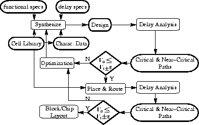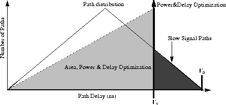 An integrated circuit is designed to meet certain functional specifications given timing, power and area constraints. The shrinking process geometries, coupled with the increased functionality of the integrated circuits have resulted in an increased complexity and level of integration of ICs since their introduction in 1961. The specified design constraints act as guidelines to optimize the integrated circuit design to meet the desired functionality. An example path distribution for an arbitrary circuit is shown in NO TAG. The figure shows the number of paths and their respective delays. If the target (specified) delay is Gt and the actual delay is Ga, then all the paths that are above the target delay are the slow signal paths, and their delays have to be reduced. The delay is not the only parameter that needs optimization -- there are other considerations as well, e.g., power and area. Ideally it is required that all the signal paths have the same delay, Gt, which implies that the fast signal paths be slowed down to save power by decreasing the width of the transistors of the gates on the these paths; however, the paths are slowed down only until there is no area or power penalty. The figure also shows the result of the circuit optimized for Area, Power and Delay" for which the delays of some of the fast paths have been increased to save power or area and there is no path with delay greater than Gt.