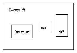 The E-type flip flop is made of a D-type flip flop, an inverting multiplexor and a nor gate. We see this hierarchy in the figure below. We can break the mutliplexor down further but this level of detail is sufficient for this section.