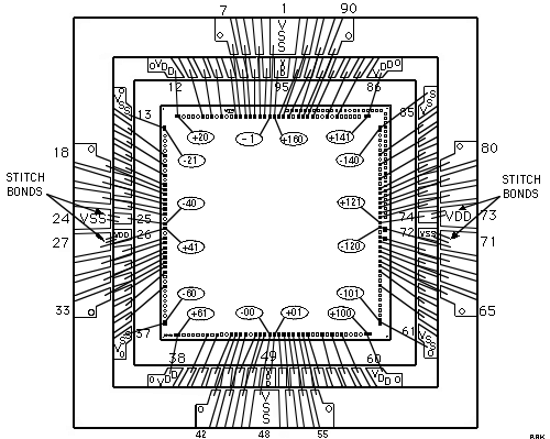 There are a total of 76 signal pins which includes "Master reset, scan signals and parametric NAND tree signals." The ASIC uses an 84-pin ceramic flatpack with four power pins and four ground pins.