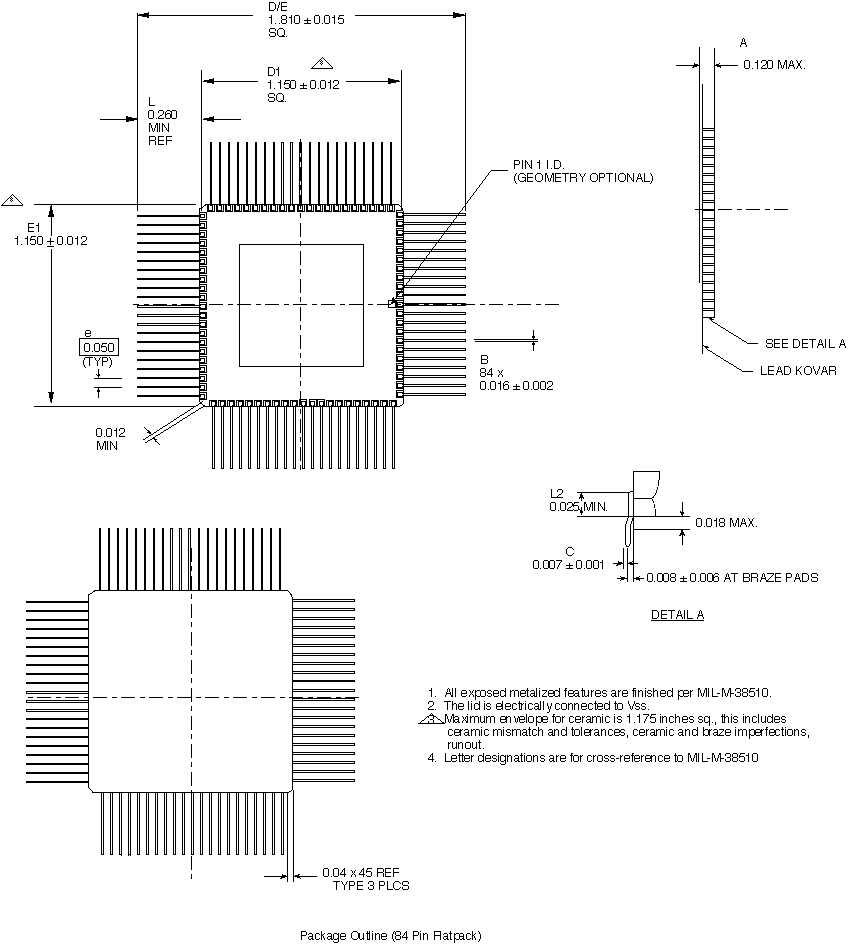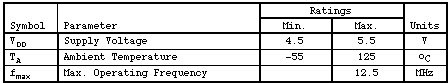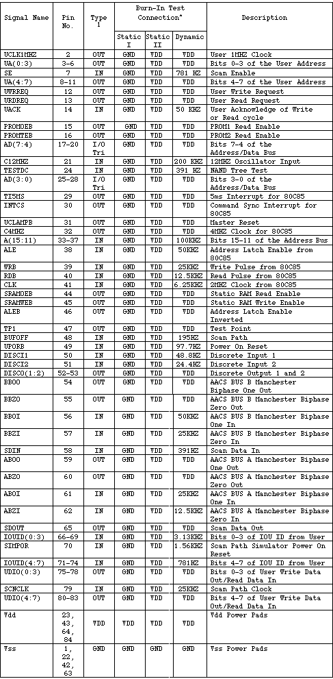 - Total Port signals 76 Inputs 32 Outputs 28 Bidirects 16 - Total VSS and VDD pins 8 - Cell and block counts: Local Global Cells 131 1921 Blocks 231 13047 - p and n-transistor counts: p: 13486 n:13399 - Number of gates: 5624 - Full internal scan - Scan port signals provided to facilitate internal scan but there is no JTAG 1149.1 implementation. - NAND tree implemented for DC tests. - Functional patterns @1MHZ are used to achieve 98.1% Port fault coverage with ac delay measurements. - 84 pin ceramic flatpack