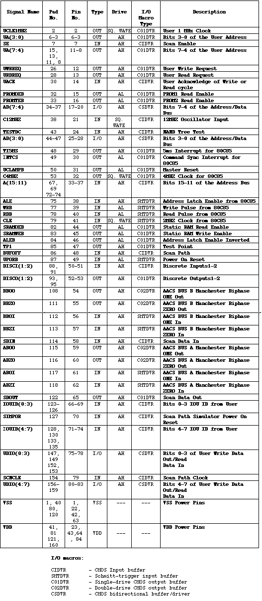 LIST OF TABLES Table 2-1. Signal Description...............................12 Table 3-1. IOU Memory Map...................................15 Table 3-2. IOU GA Worst Case Timing Spec....................18 Table 5-1. Electrical Test Requirements.....................31 Table 5-2. Absolute Maximum Ratings.........................32 Table 5-3. Recommended Operating Conditions.................33 Table 5-4. DC Performance Characteristics...................34 Table 5-5. AC Performance Characteristics...................37 Table 5-6. Burn-In Connections..............................41 Table 5-7. Delta Limits.....................................43 Table 6-1. Connections Table................................46 LIST OF FIGURES Figure 1-1. IOU GA in RT Input/Output AACS..................8 Figure 1-2. IOU GA Block Diagram............................9 Figure 1-3. IOU GA Module Diagram...........................10 Figure 2-1. IOU GA ASIC Symbol..............................11 Figure 3-1. AACS RT IOU/USER IF Timing......................19 Figure 3-2. Status Read Cycle...............................20 Figure 3-3. Local Echo Enable Write Cycle...................20 Figure 3-4. USERIF Write Cycle..............................21 Figure 3-5. USERIF Read Cycle...............................22 Figure 3-6. SRAM Write Cycle................................23 Figure 3-7. SRAM Read Cycle.................................24 Figure 3-8. PROM Read Cycle.................................25 Figure 3-9. Zero Crossing Deviation +150 on Manchester......26 Figure 3-10. Status Word Read - Valid Word Manchester........27 Figure 3-11. Zero Crossing Deviation -150 on Word Manchester.28 Figure 3-12. Status Word Read - Valid Word Manchester........29 Figure 5-1. Switching Test Circuit and Waveforms............39 Figure 6-1. IOU GA Pinout Assignments.......................44 Figure 6-2. Bonding Diagrams................................45 Figure 6-3. Package Outline (84 pin Flatpack)...............47 Figure 6-4. Marking Diagram.................................48
