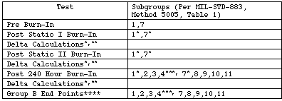 Electrical Test Requirements: This table reflects all the applicable subgroups per MIL-STD-883 concerning pre-burn-in, post-burn-in, post 240 hour burn-in, etc.
