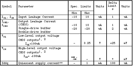 Quiescent Current (IDDQ) testing shall be accomplished by using as close to 100% "Node Toggle Vectors" as possible which can be derived from the functional vecotrs or through a process determined by The Vendor and approved by JPL. Measurement stop points will be identified by JPL. IDDQ testing will be a GO/NO GO test. A single stop point shall be established for read-and-record measurements and delta calculations. The IDDQ limit is subject to change after device characterization. Refer to contract provisions for any exceptions to the qequirements stated here and IDDQ test program development, limits and screening of flight parts for IDDQ.
