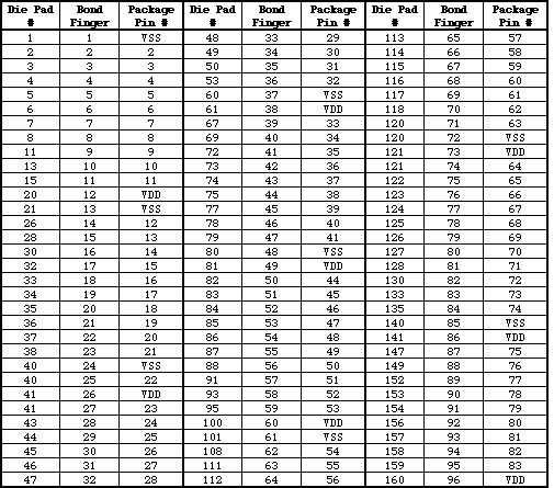 (This is a die pad to bondfinger to package pin connection table for a 84-lead top-brazed flatpak)