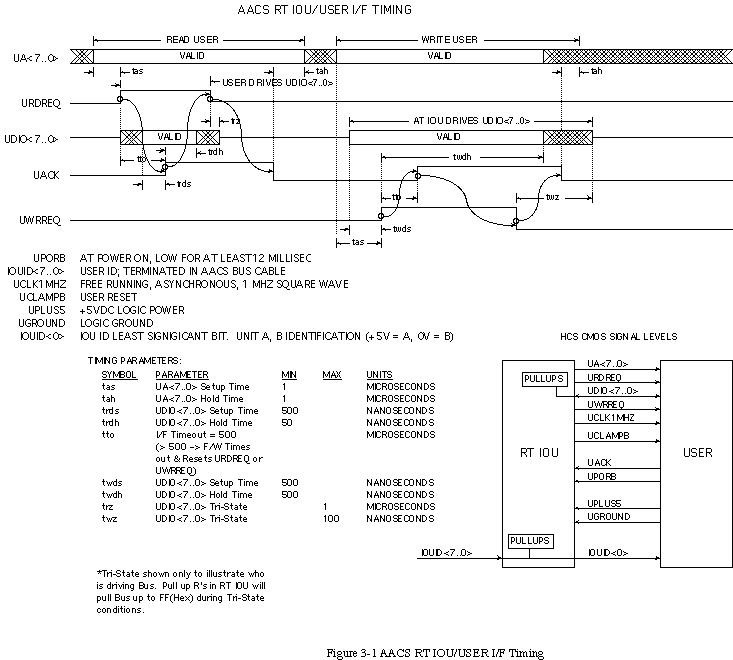 We have only shown three important timing diagrams for your reference here. On this page we show the AACS RT IOU/User Interface (I/F) Timing. On the following page we show the Status Read Cycle and Local Echo Enable Write diagrams. These are representative of good timing diagrams and show the significant functional activity relative to important clock and control signal changes.