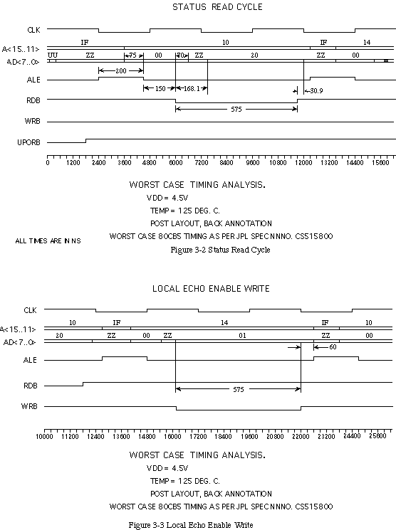 Post-layout analysis of the device shows positive margin on internal critical paths over all operating conditions. The analysis follows the same form as the pre-layout analysis, with the post-layout timing values annotated to the design file by the contractor. Timing parameters listed in Sec. 5.5 under AC characteristics are derived from post-layout data using actual wire lengths.