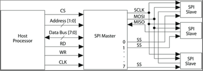 Figure 5 shows a host processor interface to an SPI master as an example of using a CPLD to implement a serial-to-parallel interface. This example creates a host processor bus interface and a complete SPI master and can be implemented in this CPLD using approximately 30% of the available logic and 25 I/O pins.
