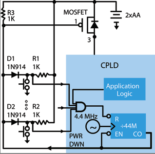 The operation is simple; all of the inputs to the CPLD are used to control a counter. If any input is active, the counter is held on reset. When all of the inputs go inactive, the counter counts until a user-defined length of time has passed. If during this time all of the inputs are still inactive, a signal is sent to disable a metal-oxide-semiconductor field-effect transistor (MOSFET), which shuts off power to the device. When any input goes active again, the internal counter is reset, power is applied, and the CPLD powers up (See Figure 7).