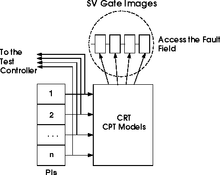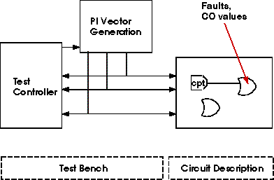 Initially the test controller reads CO and FC external data and associates this data with gates of the circuit under test. Then, the test controller starts the process of test vector generation by specifying a test scheme for the PI vector generation VHDL models. As tests are generated and applied to the circuit the following will take place for each test vector applied: