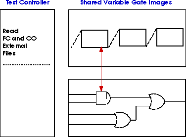 The process of selecting test vector generation scheme depends on CO information for each scheme. Also as faults are detected, a list of undetected faults is necessary for selection of a proper scheme. Because this information is frequently referred to by gate models and the test controller, we have used shared variables to store CO and FC information of the circuit gates.