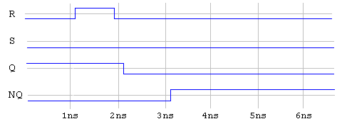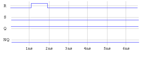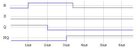 Now during simulation, say signal r changes and will cause the signal q to change, rather than schedule the event on q to occur during the next round, it is scheduled to occur 1ns form the current time. Thus the simulator must maintain a current time value. When no more events exist to be processed at the current time value, time is updated to the time of the next earliest event and all events scheduled for that time will be processed. A timing diagram for this modified SR latch produced by a simulator might be: