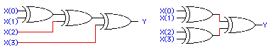 The inverted X with the multiplexor at each stage is equivalent to XOR. We then balance the XOR gates as shown below to minimize the worst case input-output delay for the circuit.