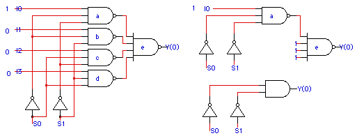 The leftmost multiplexor appears below. Constant propagation allows us to replace any NAND gate with a '0' input with a '1' on the output signal line and to delete any '1' input to an NAND gate. This eliminates gates b, c, d below, and the top input to gate a. This then allows us to drop the bottom three inputs to gate e, leaving an inverter. The NAND followed by the inverter can be replaced by an AND gate.