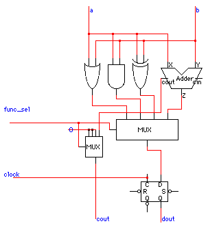 cout_delay: time; -- carry out delay reg_delay: time); -- register delay -- IO ports port ( -- Data Out (latched) dout: out std_logic_vector(0 to reg_width-1); -- A leg and B leg inputs a, b: in std_logic_vector(0 to reg_width-1); -- Carry in, 1 bit cin: in std_logic; -- Carry Out, 1 bit, unlatched cout: out std_logic; -- Function select (2 bits) -- 00 ==> ADD -- 01 ==> OR -- 10 ==> AND -- 11 ==> XOR func_sel: in std_logic_vector (0 to 1); -- Result register clock (rising edge) clk: in std_logic); end ALU;