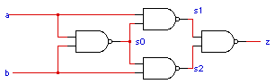 entity XOR port ( a, b : in bit; y : out bit ); end XOR; architecture nand_gates of XOR is signal s0, s1, s2: bit; component nand port ( a, b: in bit; y: out bit ); end; for all: nand use entity asic.nand2(behavioral); begin U1: nand port map ( a, b, s0 ); U2: nand port map ( a, s0, s1); U3: nand port map ( b, s0, s2); U4: nand port map ( s1, s2, y); end nand_gates;