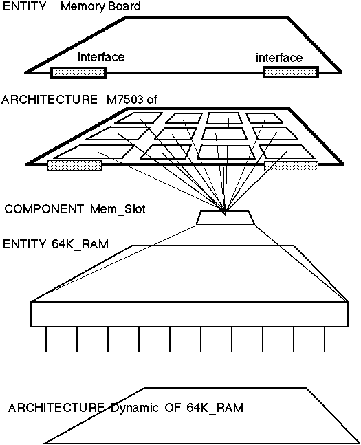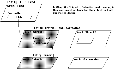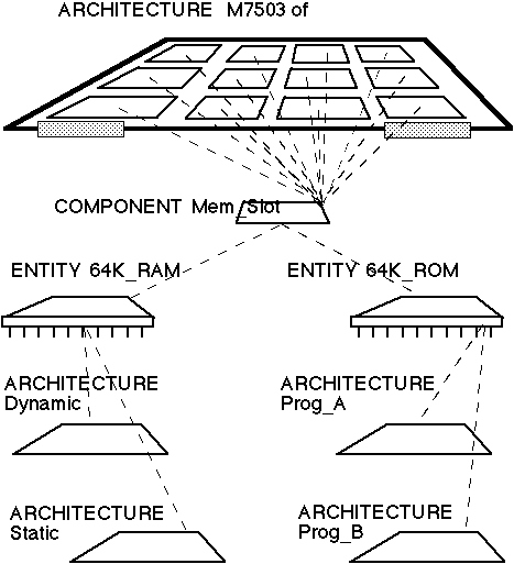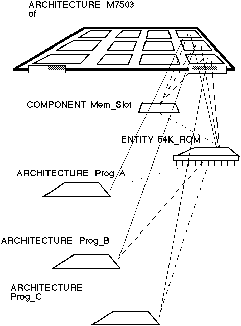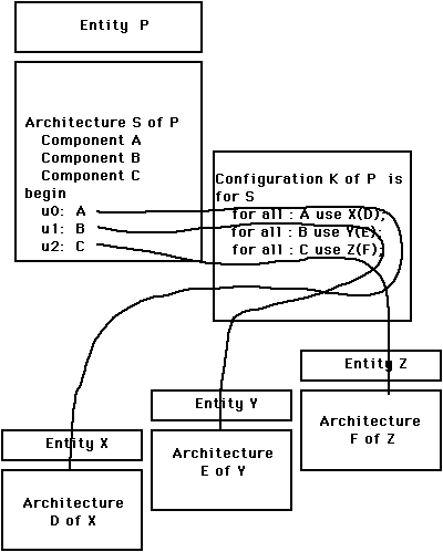 component Inverter component And3 component Xor2. . . for U7 : Inverter use entity Work.Invert ( DF_Arch); for U1, U2: And3 use entity TTL.And3 (DF_Arch); for others: And3 use entity LSTTL.And3 (DF_Arch); for all : Xor2 use entity STTL.Xor2 (DF_Arch);. . . begin -- the architectural body Use of Port Maps and Generic Maps in Configuration Specification The entities to be used for a component may not match exactly. The names of the component ports do not have to match the names used in the entity interface definition, and some of the ports of the entity may not be used. Example: entity acia is port ( -- System side data : inout byte; address : in adrs_vector; irq : out bit; bus_busy: inout bit; bus_req: out bit; data_valid: inout bit; -- Asynchronous side xmit : out bit; recv : in bit; r_strobe: in bit; async_clk: in bit ); end acia ; component sys_slot port ( -- Asynchronous side recv : in bit; strobe: in bit; -- System side D : inout byte; A : in adrs_vector; IRQ : out bit; busy: inout bit; rq: out bit; dav: inout bit ); end component; -- Now the configuration is given by for slot1, slot2 : sys_slot use entity std_cell.acia(n3703); port map (-- System side data => D, address => A, irq => IRQ, bus_busy => busy, bus_req => rq, data_valid => dav, -- Asynchronous side xmit => OPEN, recv => recv, r_strobe => strobe, async_clk => OPEN );