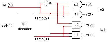 entity decoder is generic (N : integer); port ( sel : bit_vector ( 1 to N ); Y : bit_vector (1 to 2**N) ); end decoder; architecture recursive_form of decoder is signal nsel : bit; component and2 port (i1,i2: bit; y: out bit); end component; omponent inverter port (i1: bit; y: out bit); end component; component decoder generic ( n : integer ); port (sel : bit_vector; y: out bit_vector); end component; begin inv: inverter port map (sel(N), nsel); ase: if N=1 generate Y(1) <= sel(1); Y(2) <= nsel; end generate; recurse: if N>1 generate b1: block signal temp : bit_vector ( 1 to 2**(N-1) ); begin dcd: decoder generic map (N-1) port map (sel(1 to N-1), temp); drv: for i in 1 to 2**(N-1) generate s1: and2 port map (temp(i),sel(N),Y(2*(i-1)+1) ); s2: and2 port map (temp(i), nsel , Y(2*i) ); end generate; end block; end generate; end recursive_form;