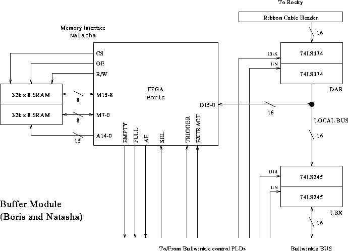 As mentioned in Section 4.3, each buffer module features a 16 bit local bus connecting the FPGA, the ribbon cable input register, and the B-bus (to PC data bus and other buffer modules). The 16 bit path from the FPGA to and from the SRAM must be separate from the local bus to allow pipelining of incoming data. In addition, there is an address bus from the FPGA to the SRAM. The functionality of the address and data connections between the FPGA and the SRAM is encapsulated in the specification of Natasha. Natasha is actually just a VHDL module which gets synthesized into the FPGA alongside Boris' other data-handling functions. However, Natasha is conceptually separate in that if a different memory component (such as a FIFO or different sized SRAM) were used only the Natasha module would have to be redesigned. Also, the Natasha module will hopefully be reusable by any VHDL-based FPGA design which needs an SRAM interface.