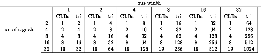 Using tristate drivers, a similar signal selection can be implemented with a tristate bus (see figure 3). Depending on the FPGA part, Xilinx supports between 16 and 64 three-state busses (``longlines'') per chip and between 10 and 34 tri-state buffers per longline. If these longlines are not used by any other circuitry, using them for signal selection allows to pack more functionality in a single FPGA.