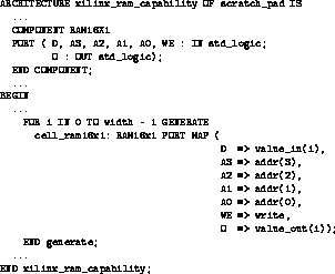 To generate this design, we use macros from the Xilinx XACT library, which are instantiated as VHDL components in the VHDL description (see figure 7). An alternative way to create RAMs based on the Xilinx RAM capability is to use the memgen tool [Xil94b] from the XACT distribution and include the resulting RAM as COMPONENT.