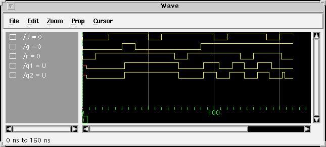 The 'wave' window is used to display signal waveforms during simulation execution. I have prepared a command file to add signals to this window; the file is called 'wave.do' and is in the 'src/' directory. To execute this command file, type:
