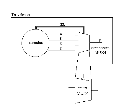 A component declaration is needed (component MUX4 ... end component;) in order to pull the MUX4 entity into the test bench. Think of a component declaration as a chip socket. It allows a VHDL structural description to be written in a top-down manner, because the VHDL compiler can check the consistency of the design unit that uses the component before the corresponding design entity has been written.