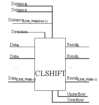 Note 1: LPM_WidthDist specifies the width of the Distance port. The values on the Distance port would normally range from 0 which would mean "no shift" to (LPM_Width-1) which would be the maximum meaningful shift. The typical value assigned to LPM_WidthDist would be "the smallest integer not less than log2(LPM_Width)" or log2LPM_Width. Any value on the Distance port greater than LPM_Width-1 results in an UNDEFINED output.