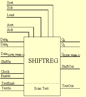 Note 1: A left shift implies that the data is being shifted into the LSB and out the MSB. The LSB gets the value on the ShiftIn port. The ShiftOut port is always equal to QLPM_Width-1.