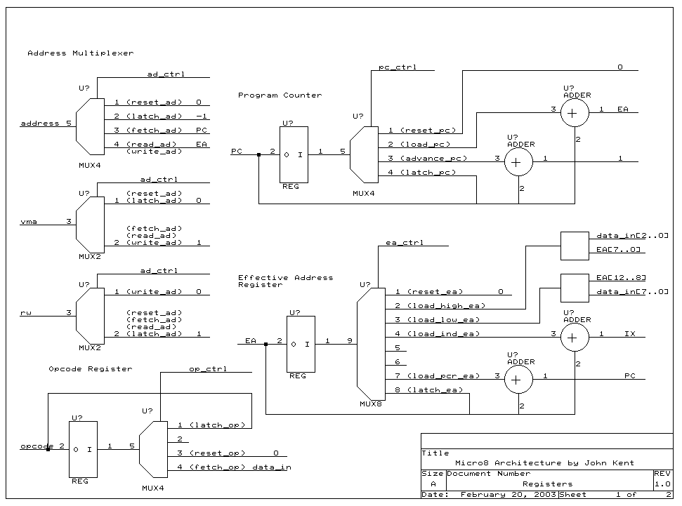 Micro8 started of as a minimal set 4 instruction computer By Tim Boscke designed to fit in a 32 Macrocell CPLD.
