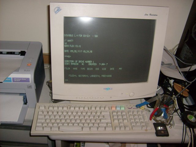 The following is a picture of Flex9 running on System09 on the B3-Spartan2+ board. It displays the boot sequence and the directory of an empty drive partition on the CF card. Note that the display is white on black, although the photo appears to have a slight green tinge to it. I think that has more to do with the camera than anything else.