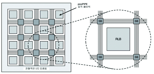 picoPIPE 패브릭은 프로그래밍이 가능한 패브릭으로 연결된 한 개의 RLB (Re-configurable Logic Blocks) 어레이로 구성된다. 각각의 RLB들은 스위치 박스(SB)에 둘러싸여 있다. 스위치 박스는 picoPIPE 패브릭 상에서 글로벌 신호의 루트를 정한다.
