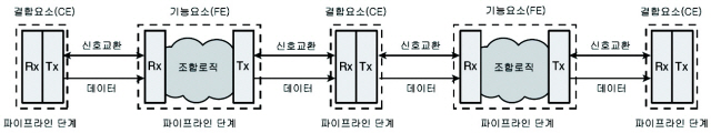 FE는 조합로직(combinatorial logic)과 기능성에 있어서 동일하다. 유일한 차이점은 데이터의 진출입을 다루는 방법이다. picoPIPE 내부의 로컬 신호교환(handshake)은 FE가 반드시 데이터를 내외부로 주고받아야 한다고 규정한다. 이런 신호교환 방법론은 유효하고 정착된 데이터만이 전달될 수 있다는 것을 분명히 해 주고 있다.