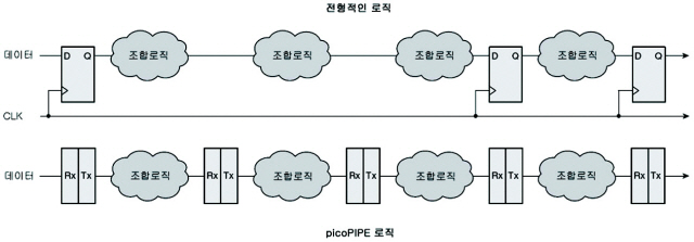 이와는 현저히 달리, picoPIPE 기술은 로직 기능성을 변화시키지 않고도 최적의 파이프라인 작업을 허용한다(그림 4). 각각의 파이프라인 단계는 로직 레벨이 적은 편이어서, 매우 빠르게 작동을 완수한다. 이는 로직을 통과하는 데이터 토큰의 비율을 증가시키며, 이는 효과적인 클록 비율을 증가시킨다(picoPIPE 기술에선 데이터 토큰이 유효한 데이터와 클록 정보와의 조합이라는 점을 기억하자).