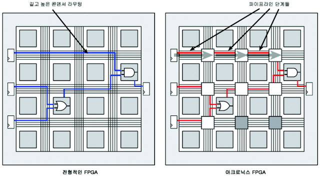 아크로닉스 FGPA 내부에서는 내장 파이프라인 작업으로 신호들이 단지 확실히 짧은 라우팅 트랙만 여행할 필요가 있다. 이는 각 단계에서 신호의 전기용량을 감소시킨다. 더 큰 디바이스에서 신호들은 여전히 디바이스의 한 코너에서 다른 쪽으로 통과해야 한다.
