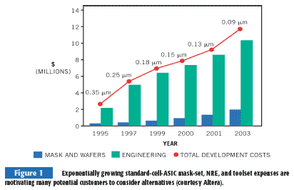 FPGAs are becoming increasingly dense in gate count on a per-chip basis, thanks to the deep-submicron processes on which they're manufactured, such as Xilinx's 90nm process for its latest Spartan-3 family (Reference 1). The usable capacity they deliver is particularly lofty if your design employs their embedded memory arrays and diffused analog-and digital-function blocks, such as DLLs and PLLs, multiply-accumulators, SERDES (serializer/ deserializer) circuits, high-speed I/O buffers, and, in some cases, even CPU cores and associated peripherals. You can order as few or as many FPGAs as your design requires, and you need not pay NRE (nonrecurring-engineering) charges to their supplier. The vendor has already laid out and debugged the chips' logic, memory, signal-routing, and power planes.