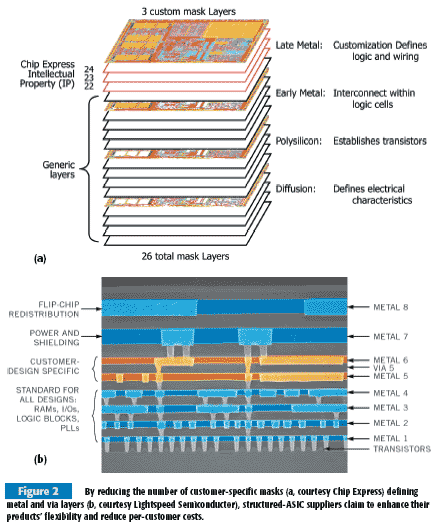 Some ASIC suppliers, alarmed by the evaporation of their business, have combined a page or two from the FPGA book of tricks with lessons learned in their gate-array past lives to come up with the structured ASIC. Some also refer to this approach as a modular array or structured array. Plenty of vendor-to-vendor technological differences exist, but simplistically speaking, a structured ASIC is a gate-array derivative with an FPGA-like, coarse-grained logic cell, thereby requiring fewer user-configurable metal and via layers (Figure 2). The vendor handles clock-tree and power-plane routing. An analogy might prove helpful in under-standing the structured-ASIC pitch: In the early days of software programming, microprocessors were slow, and memory was expensive, so low-level, highly efficient assembly language and even lower level machine code dominated.