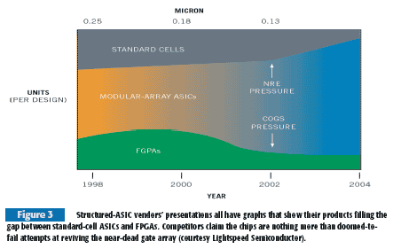 As CPUs have grown faster and memory has become cheaper, higher level software languages have taken over. They use resources less efficiently, but efficiency isn't so essential nowadays. Time to market is increasingly important, though, and high-level languages excel in this regard. For similar reasons, VHDL and Verilog are increasingly the design-entry methods that hardware engineers who put circuits into chips choose over the more time-consuming schematic-capture technique. The structured-ASIC vendors are gambling that a market will also emerge for a silicon platform that, although it may be less efficient than a standard cell and deliver a longer time to market than an FPGA, doesn't exhibit the full extent of those competitors' shortcomings, either (Figure 3).