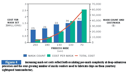 On the other end of the spectrum are companies such as Fujitsu, which has a 0.11-micron structured-ASIC process now in production and a 0.09-micron process coming out in 2004, and NEC, which forecasts that its 90nm process will also be in production by the second half of next year. Tailoring the process to the design is a delicate balancing act that also involves comprehending the design's I/O-buffer count; the last thing the vendor and customer want to have happen is for the die to contain unused, thereby silicon-wasting area within a minimum-size-constraining I/O ring. Escalating costs for complex packages also make the cost of any silicon inside the package proportionally irrelevant (Reference 3).