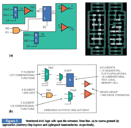 AMI Semiconductor, Chip Express, Faraday Technology, Fujitsu, Lightspeed Semiconductor, NEC, and ViASIC are some of the companies now touting their structured-ASIC wares. AMI is the only vendor on this list not currently positioning itself as a broad-based silicon supplier; the company is sticking with its FPGA conversion niche but employing a structured-ASIC foundation instead of the gate-array platform of the past. Conversely, Lightspeed Semi-conductor has retreated from a brief expansion into the Xilinx FPGA cost-reduction market to exclusively focus on conventional ASICs (Reference 2). Chip Express's structured ASICs employ perhaps the finest-grained logic block of the various alternatives; the vendor estimates that its devices will encompass three to four gates per logic module, depending on the design. Most of the other vendors' logic blocks each implement 20 to 40 gates' worth of your design (Figure 5).