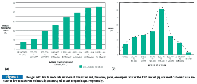 Structured-ASIC suppliers build their chips on a diverse mix of processes. This multiplicity reflects each vendor's attempt to tailor its offerings for an exclusive slice of the potential customer-base pie. Vendors and, where applicable, their foundries have already amortized the fabrication facilities and equipment they use to build trailing-edge, well-understood, and high-yielding, 0.18-, 0.25-, and 0.35-micron processes. There's an upper limit to the design size you can implement in them, but the relevant vendors point out the analyst reports indicating a large percentage of ASIC designs having fewer than 1 million gates, along with data suggesting that customers use half of all ASIC designs in volumes of less than 100,000 units (Figure 6).
