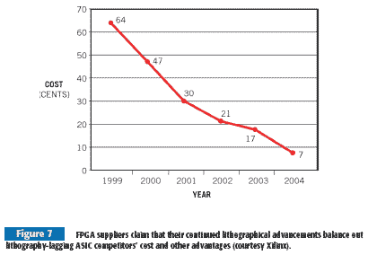 Toshiba claims that routing errors, not logic bugs, necessitate most design respins and, therefore, a hybrid standard-cell-plus-gate-array platform, such as the one that it offers, will meet most customers' needs. Xilinx has similar pessimistic feedback about structured-ASIC vendors' prospects; the company believes that, by migrating its FPGAs to advanced lithographies, it can negate any advantages that the comparably trailing-edge-process-based structured-ASIC might otherwise possess (Figure 7).