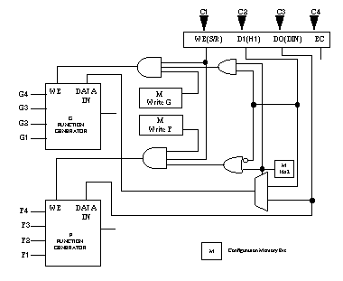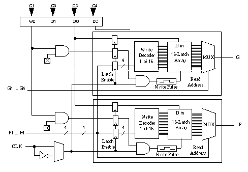 RAM Inputs and Outputs --- The F1-F4 and G1-G4 inputs to the function generators act as address lines, selecting a particular memory cell in each look-up table. The functionality of the CLB control signals changes when the function generators are configured as RAM. The DIN/ H2, H1, and SR/H0 lines become the two data inputs (D0, D1) and the Write Enable (WE) input for the 16x2 memory. When the 32x1 configuration is selected, D1 acts as the fifth address bit and D0 is the data input. The contents of the memory cell(s) being addressed are available at the F¡¯ and G¡¯ function-generator outputs. They can exit the CLB through its X and Y outputs, or can be captured in the CLB flip-flop(s). Configuring the CLB function generators as Read/Write memory does not affect the functionality of the other portions of the CLB, with the exception of the redefinition of the control signals. The H¡¯ function generator can be used to implement Boolean functions of F¡¯, G¡¯, and D1, and the D flip-flops can latch the F¡¯, G¡¯, H¡¯, or D0 signals.