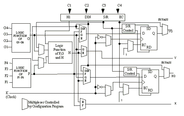 Figure 1. Each CLB contains a pair of flip-flops and two independent 4-input function generators. These function generators have a good deal of flexabilty as most combinatorial logic functions need less than four inputs. Thirteen CLB inputs and four CLB outputs provide access to the functional flip-flops. Configurable Logic Blocks implement most of the logic in an FPGA. The principal CLB elements are shown in Figure 1. Two 4-input function generators (F and G) offer unre-stricted versatility. Most combinatorial logic functions need four or fewer inputs. However, a third function generator (H) is provided. The H function generator has three inputs. One or both of these inputs can be the outputs of F and G; the other input(s) are from outside the CLB. The CLB can therefore implement certain functions of up to nine variables, like parity check or expandable-identity comparison of two sets of four inputs.