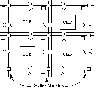 Figure 7 illustrates the single-length interconnect surrounding one CLB in the array. Each Switch Matrix consists of programmable n-channel pass transistors used to establish connections bewteen the single-length lines. For example, a signal entering on the right side of the Switch Matrix can be routed to a single-length line on the top, left or bottom sides, or any combination thereof. Single-length lines are normally used to conduct signals within a localized area and to provide the branching for nets with fanout greater than one.