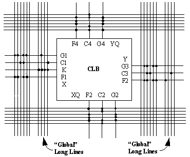 The function generator and control inputs to the CLB (F1-F4, G1-G4, and C1-C4) can be driven from any adjacent single-length line segment. The CLB clock (K) input can be driven from one-half of the adjacent single-length lines. Each CLB output can drive several of the single-length lines, with connections to both the horizontal and vertical Longlines.